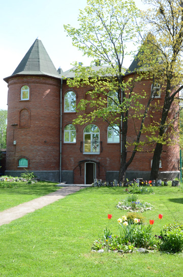 от Финляндского вокзала до станции "Левашово". От станции лучше всего идти по Железнодорожной улице (параллельна железнодорожным путям) до пересечения с улицей Коммуны, по которой нужно пройти порядка ста метров до кирпичного забора с зелёной калиткой и воротами. За забором будут хорошо видны башни коттеджа (фотография в начале этой записи).